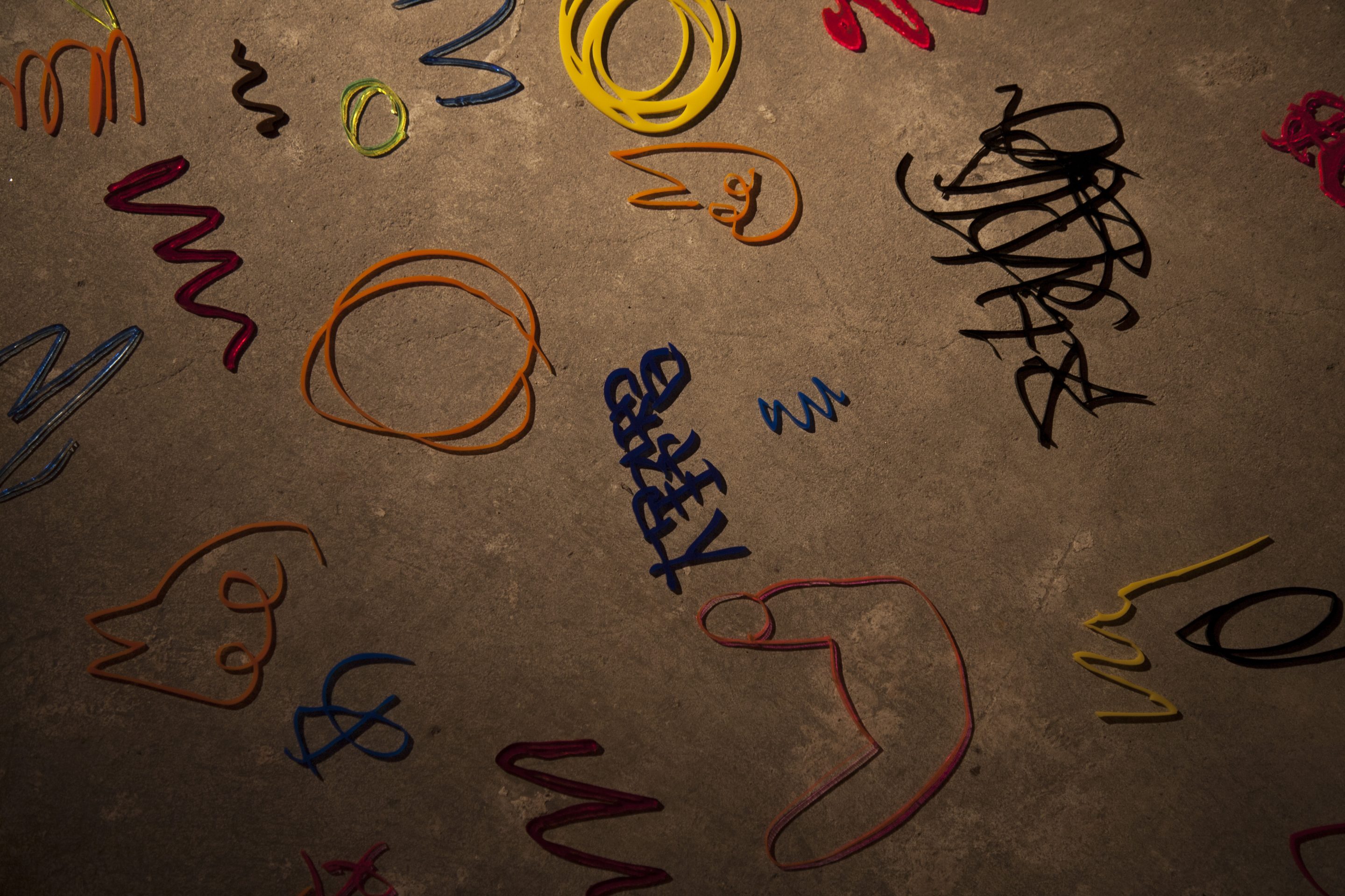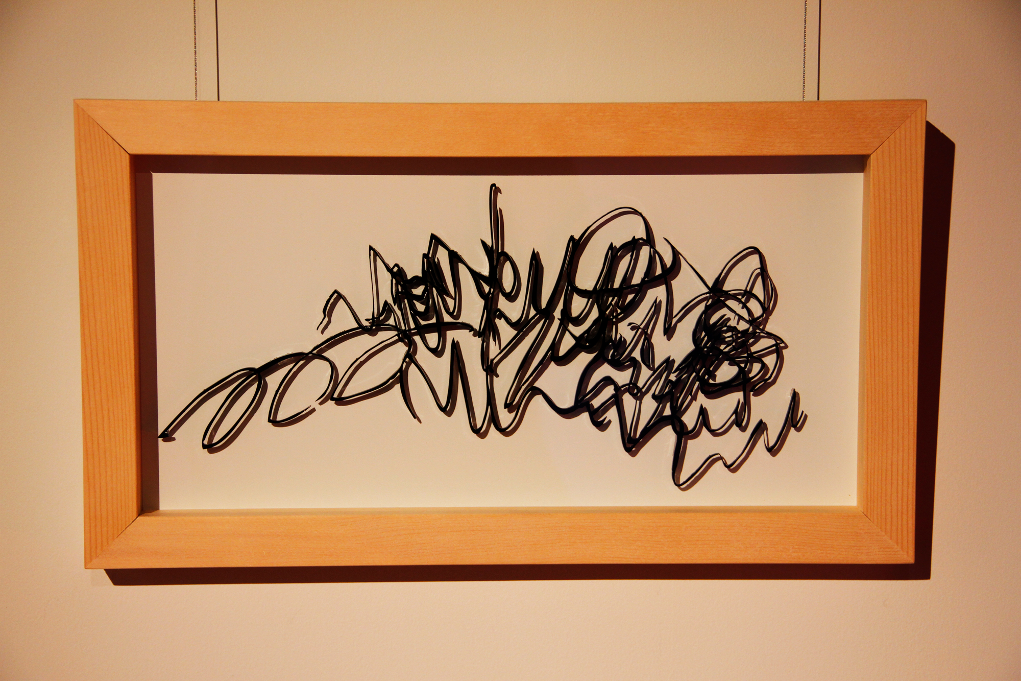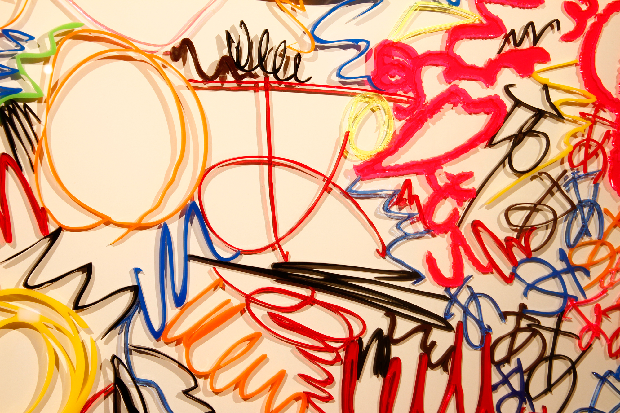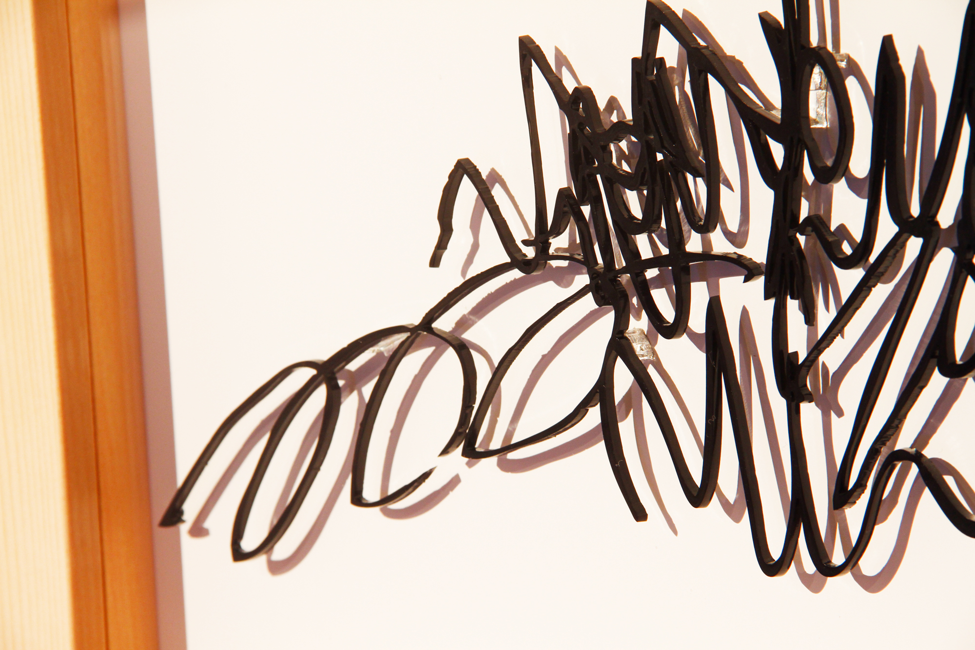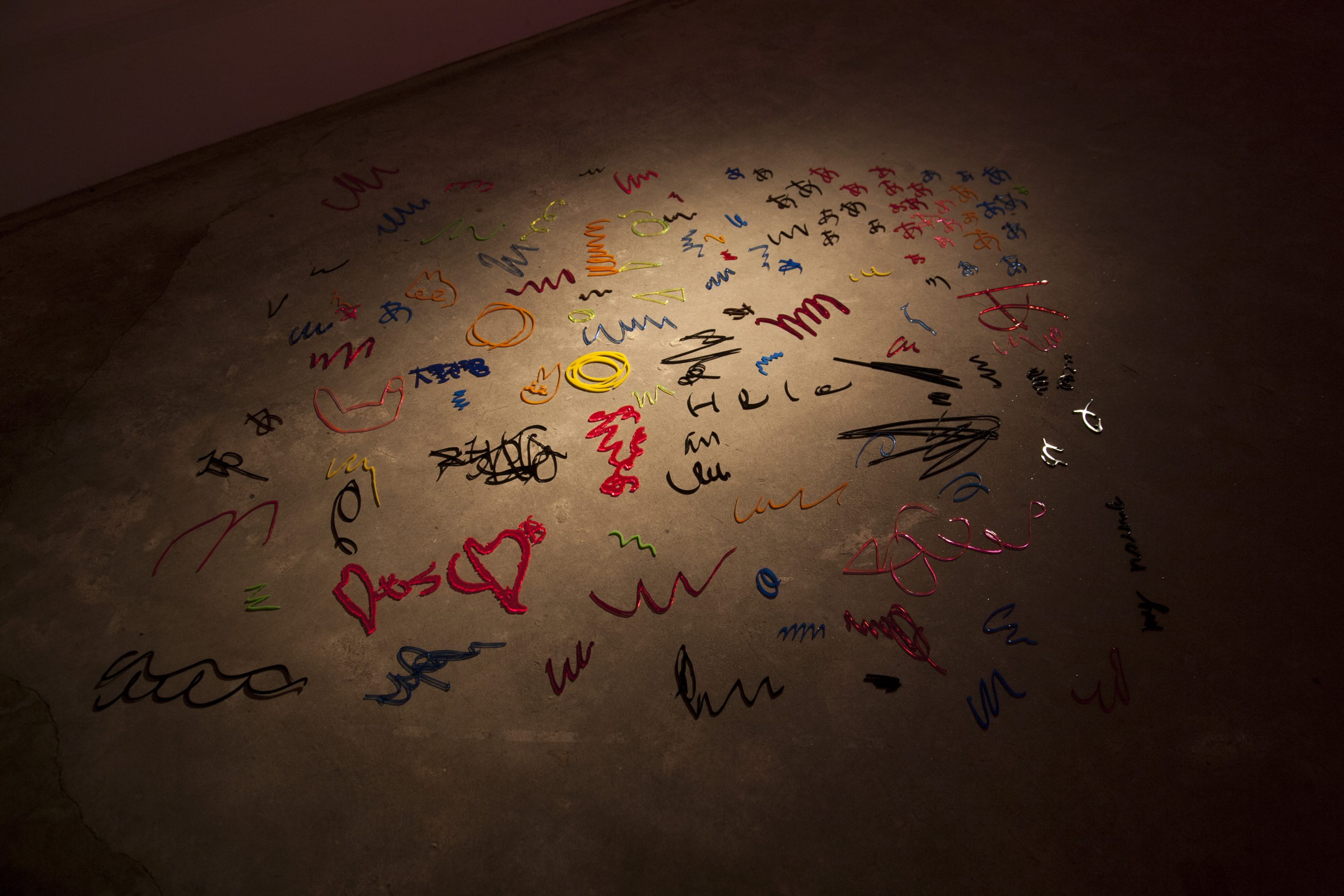 formless works samples the memos you see at stationery and bookstores where people test out writing utensils, and create works by extracting the writing leftover on those memos. By changing the wandering lines and symbols taken from the memos into acrylic and neon tubes, it changes worthless and meaningless trash into valuable materials, and it is that transformation system that is the work. The project approach of formless works, whose sampling is taken from various places and regions, is to expose passing, everyday fragments that everyone has likely experienced (yet, no one can remember what they wrote). You could say that it is a social cropping method that differs from the documentary-type method of narrowing the focus to a specific matter or problem and then investigating society from a different point of view. Rather than a special event, by gathering the experience fragments that are forgotten from daily life as if they flow together with time, and reconstructing them into a work, I believe it is possible to more accurately trace realistic societies.
