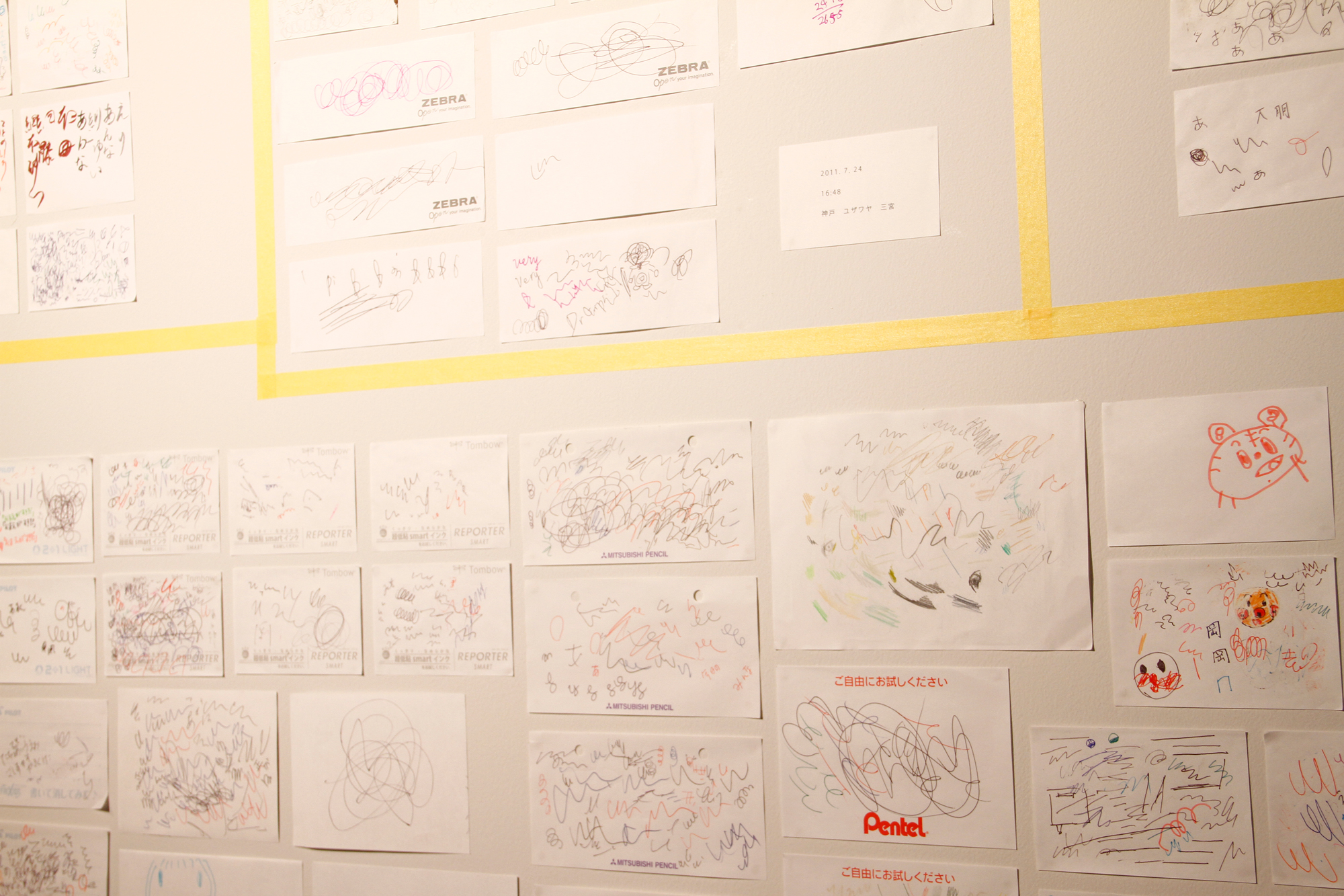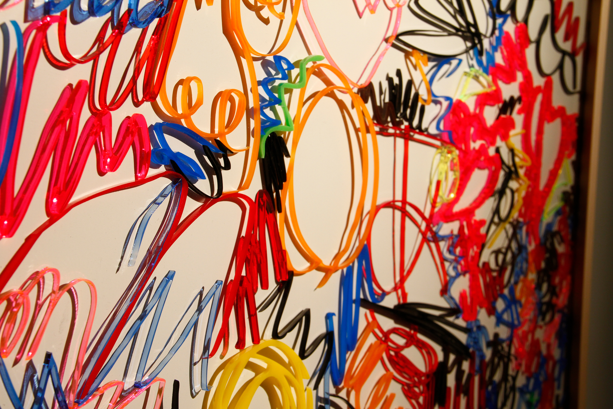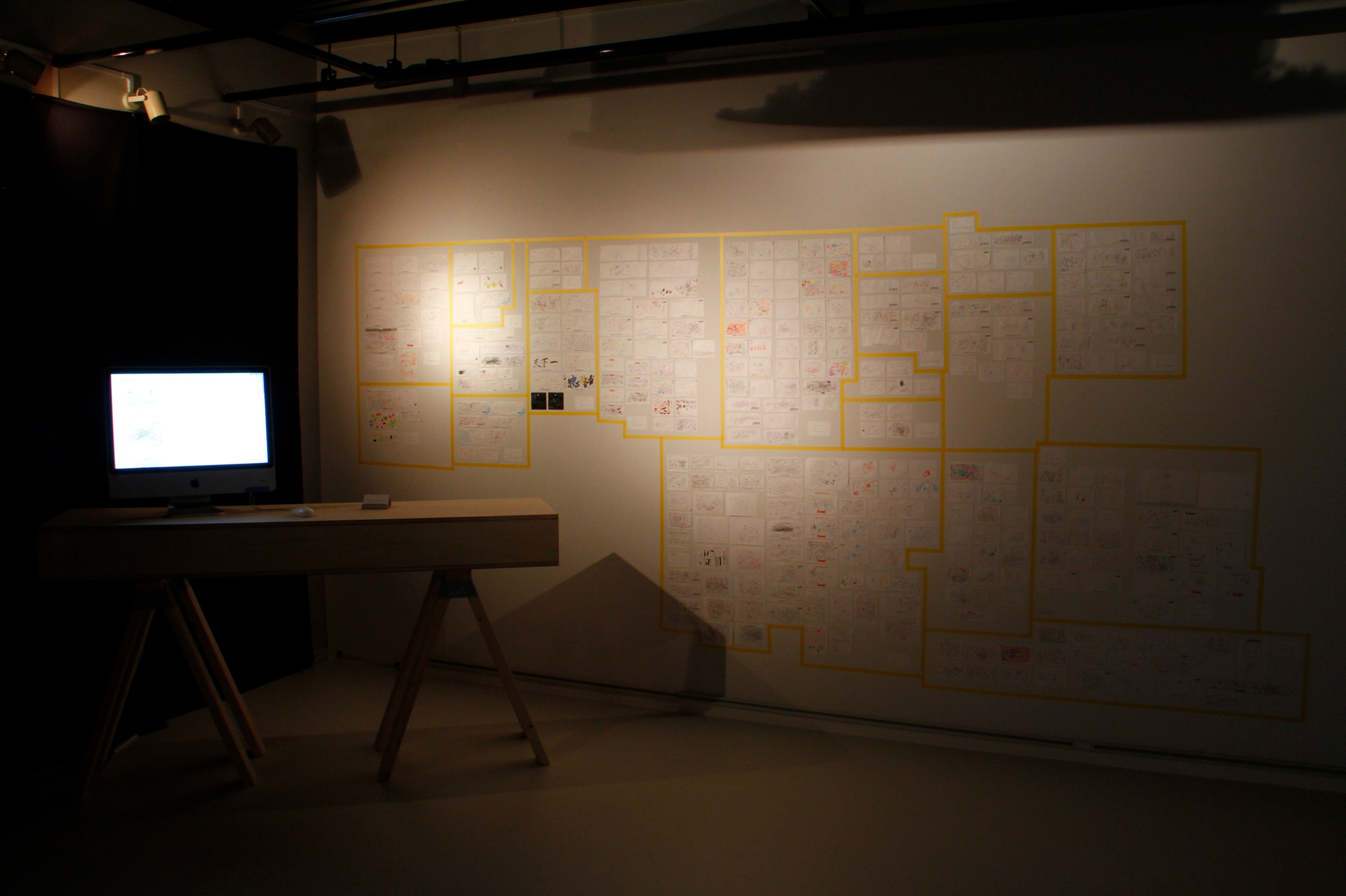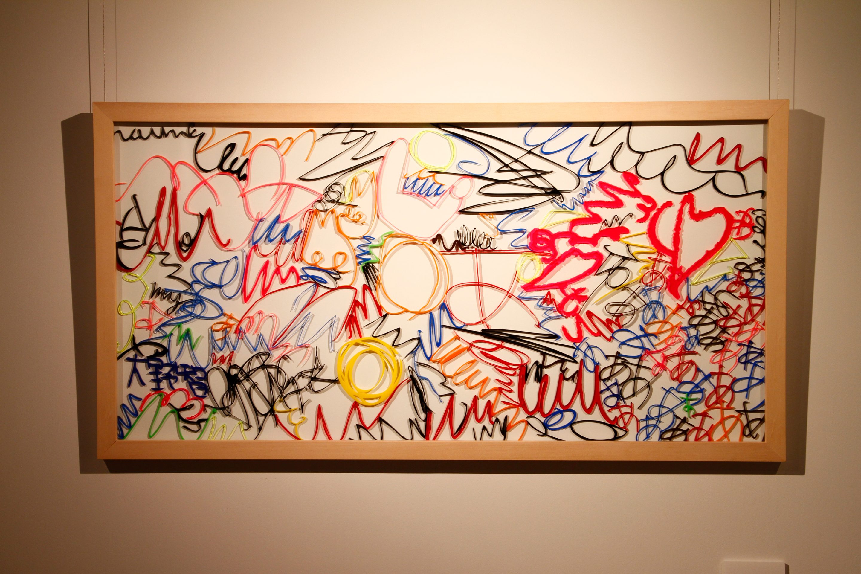 formless works samples the memos you see at stationery and bookstores where people test out writing utensils, and create works by extracting the writing leftover on those memos. By changing the wandering lines and symbols taken from the memos into acrylic and neon tubes, it changes worthless and meaningless trash into valuable materials, and it is that transformation system that is the work. The project approach of formless works, whose sampling is taken from various places and regions, is to expose passing, everyday fragments that everyone has likely experienced (yet, no one can remember what they wrote). You could say that it is a social cropping method that differs from the documentary-type method of narrowing the focus to a specific matter or problem and then investigating society from a different point of view. Rather than a special event, by gathering the experience fragments that are forgotten from daily life as if they flow together with time, and reconstructing them into a work, I believe it is possible to more accurately trace realistic societies.
