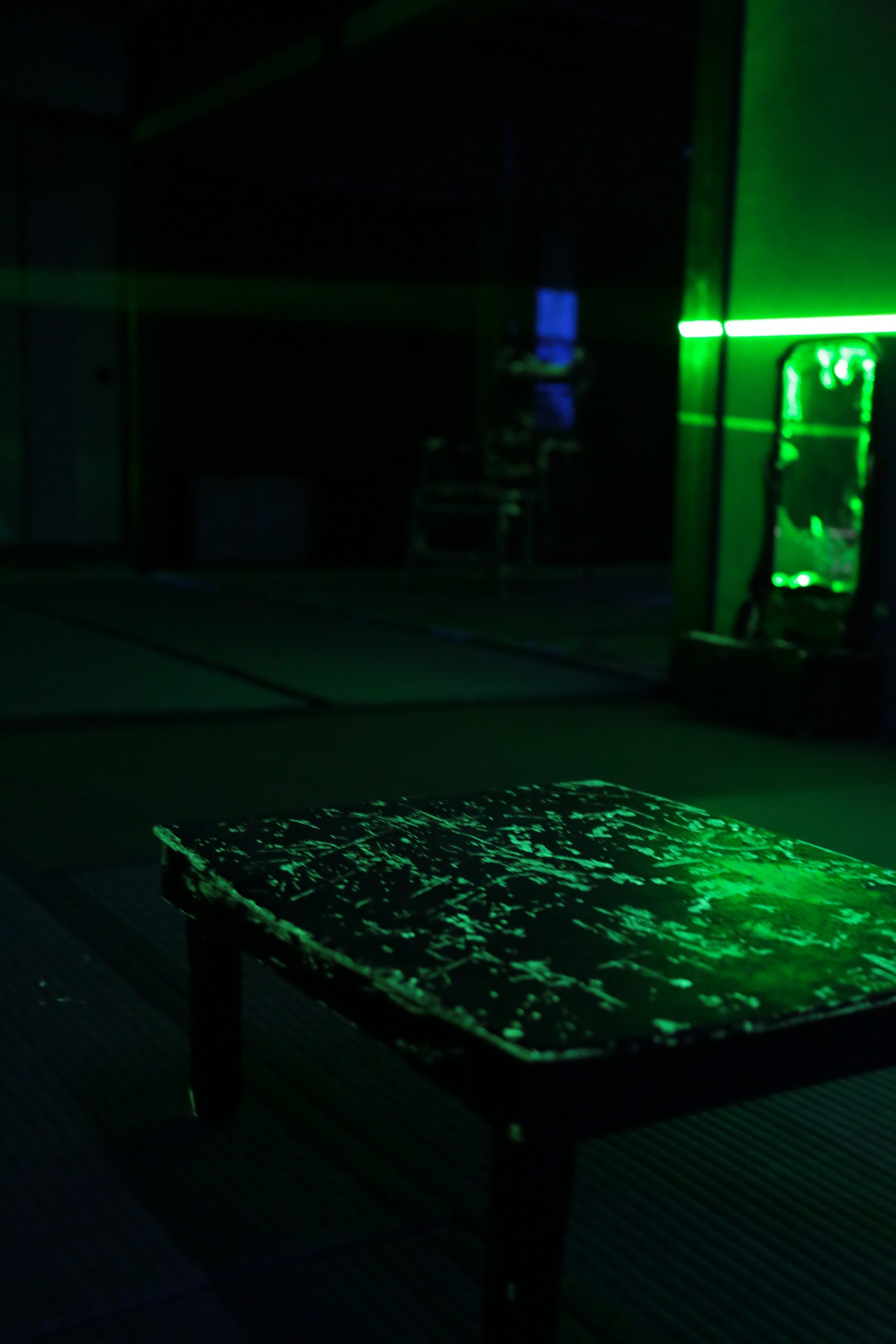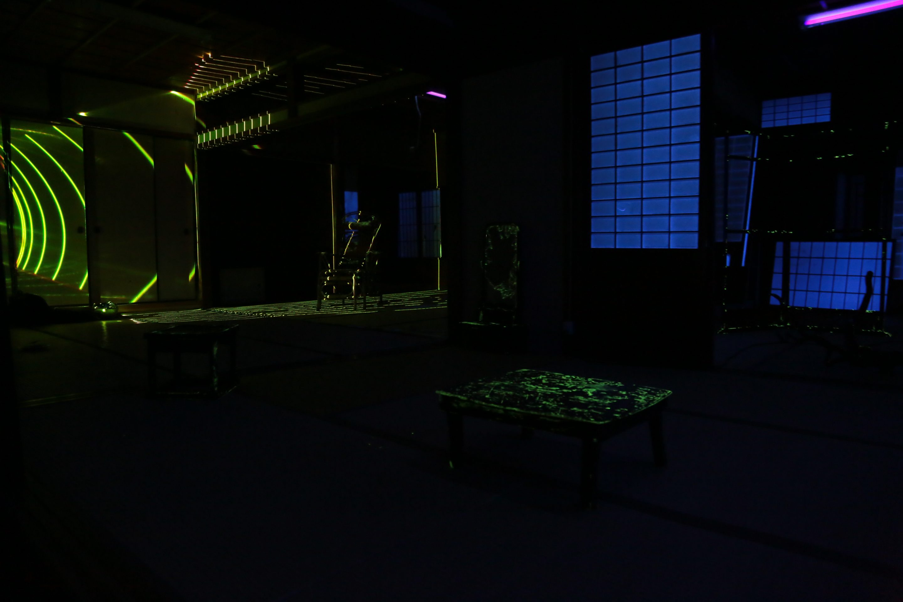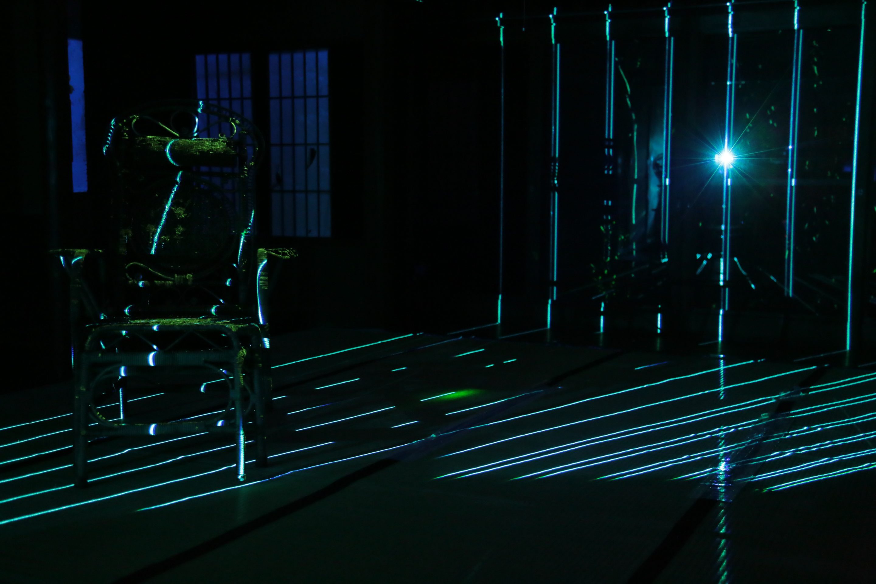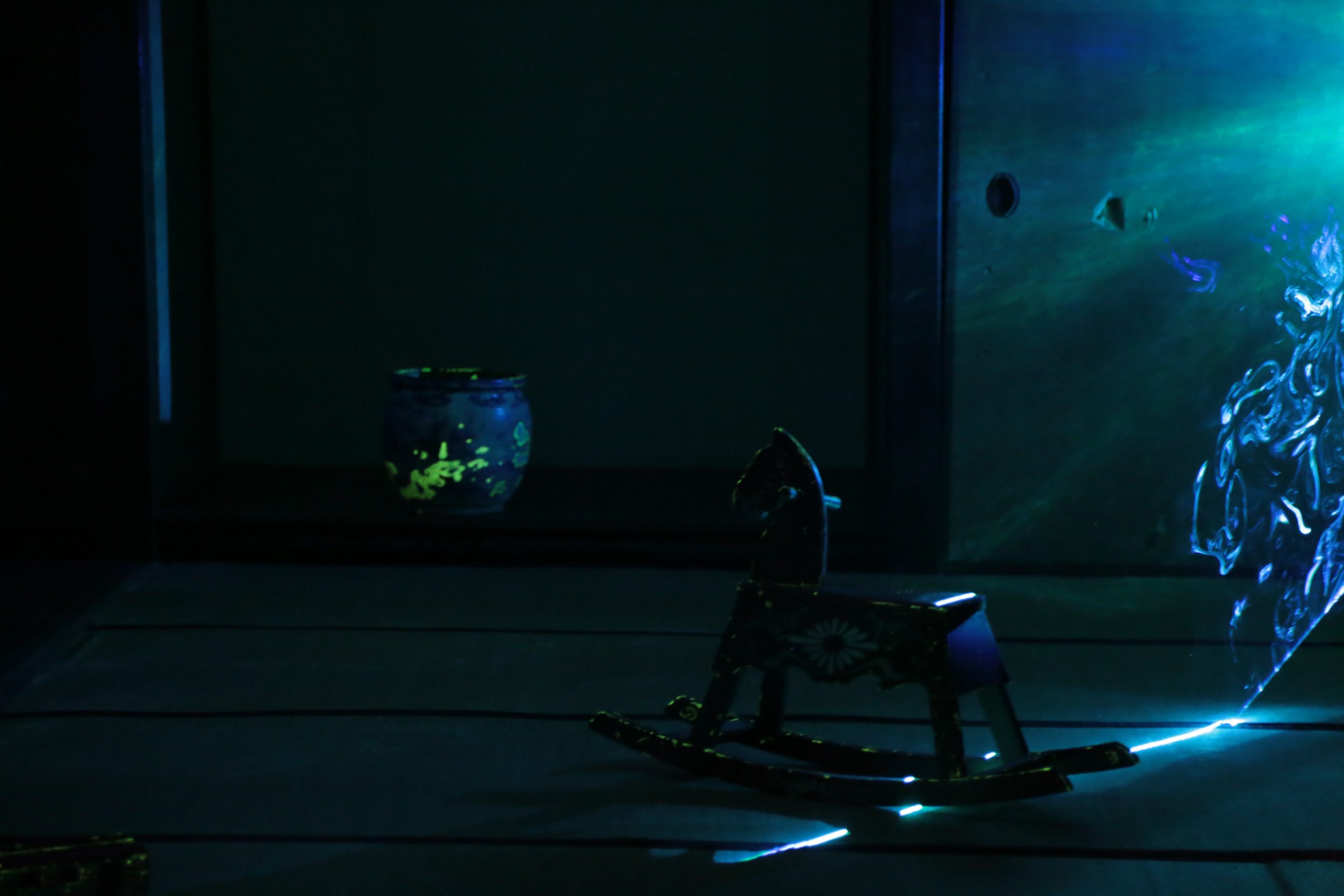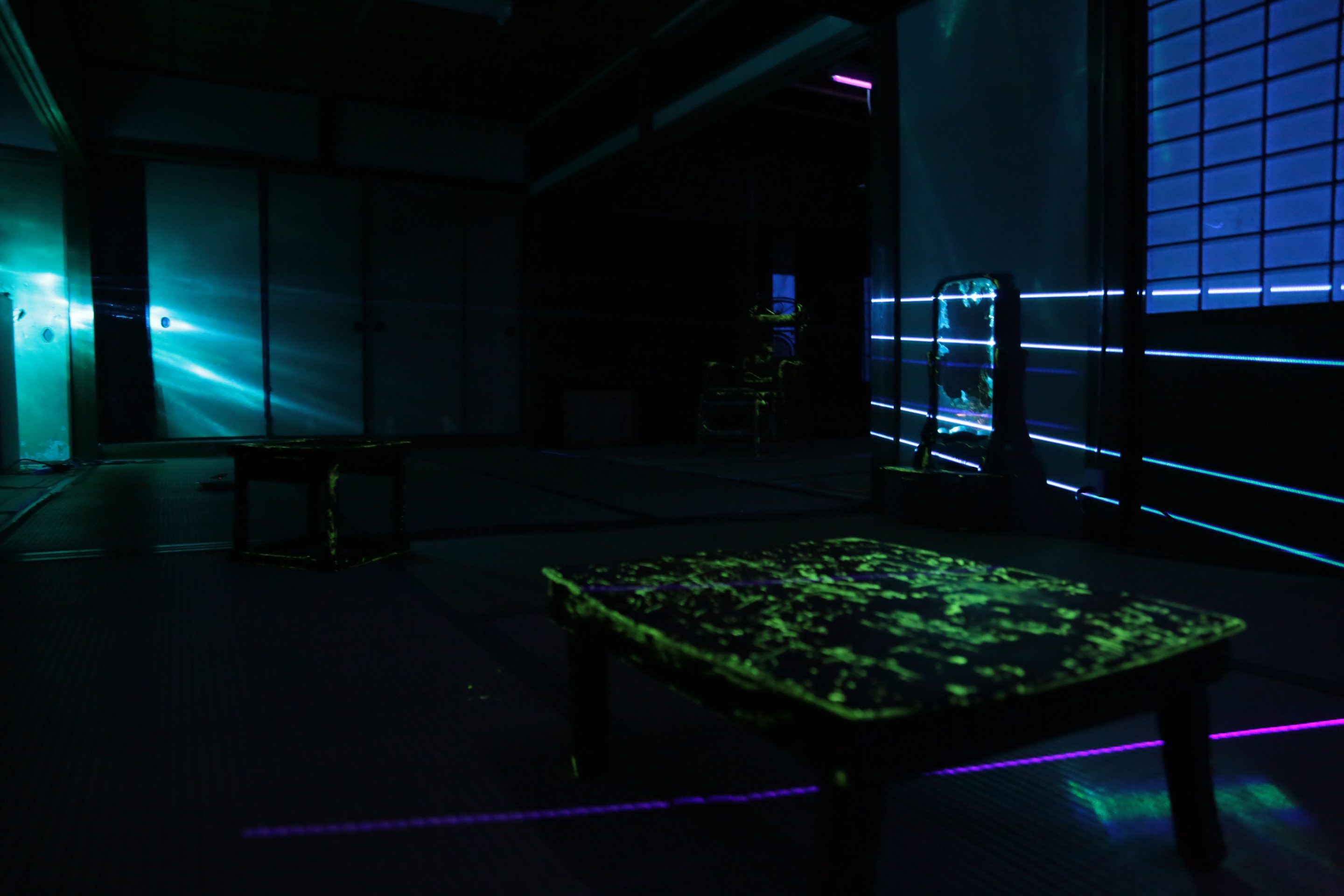 Hashima Light and Shade faintly illuminates the traces of the livelihood that remains in the old tools, furniture, toys, etc. Found in an old Japanese-style house through luminescent paint and laser lights. It is an installation work where the memories of a location are spun together through “light.”