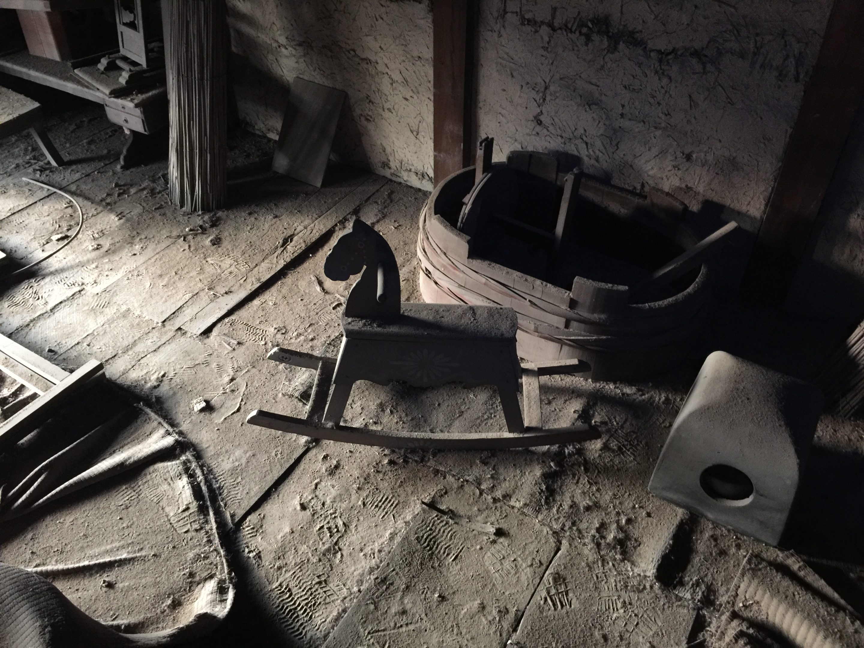 《羽島光陰》は、古民家にある古道具や家具、おもちゃ等に残る生活の痕跡を、蓄光塗料とレーザー光により淡く浮かび上がらせる。場所のもつ記憶が「光」によって紡ぎだされるインスタレーション作品。