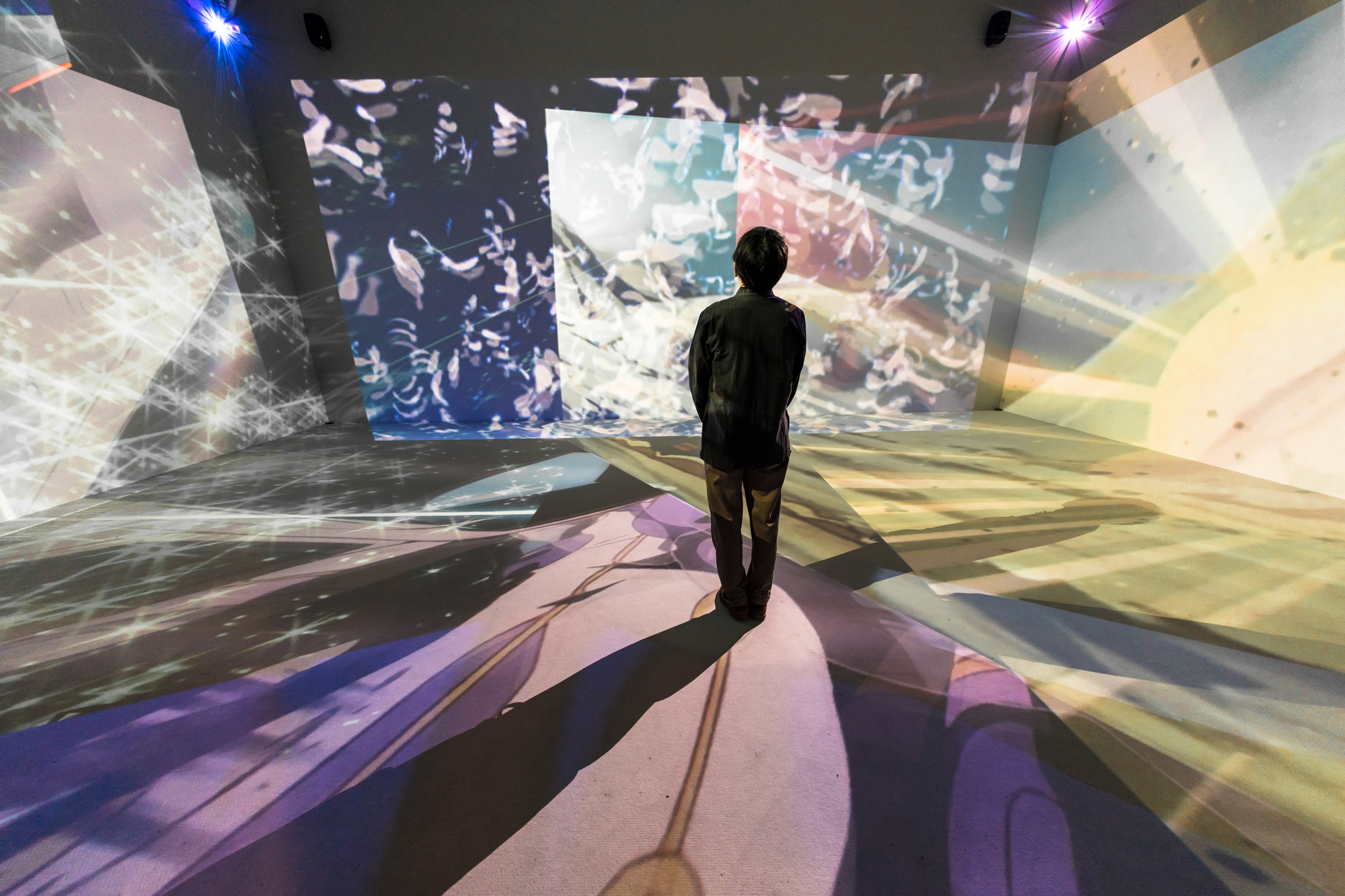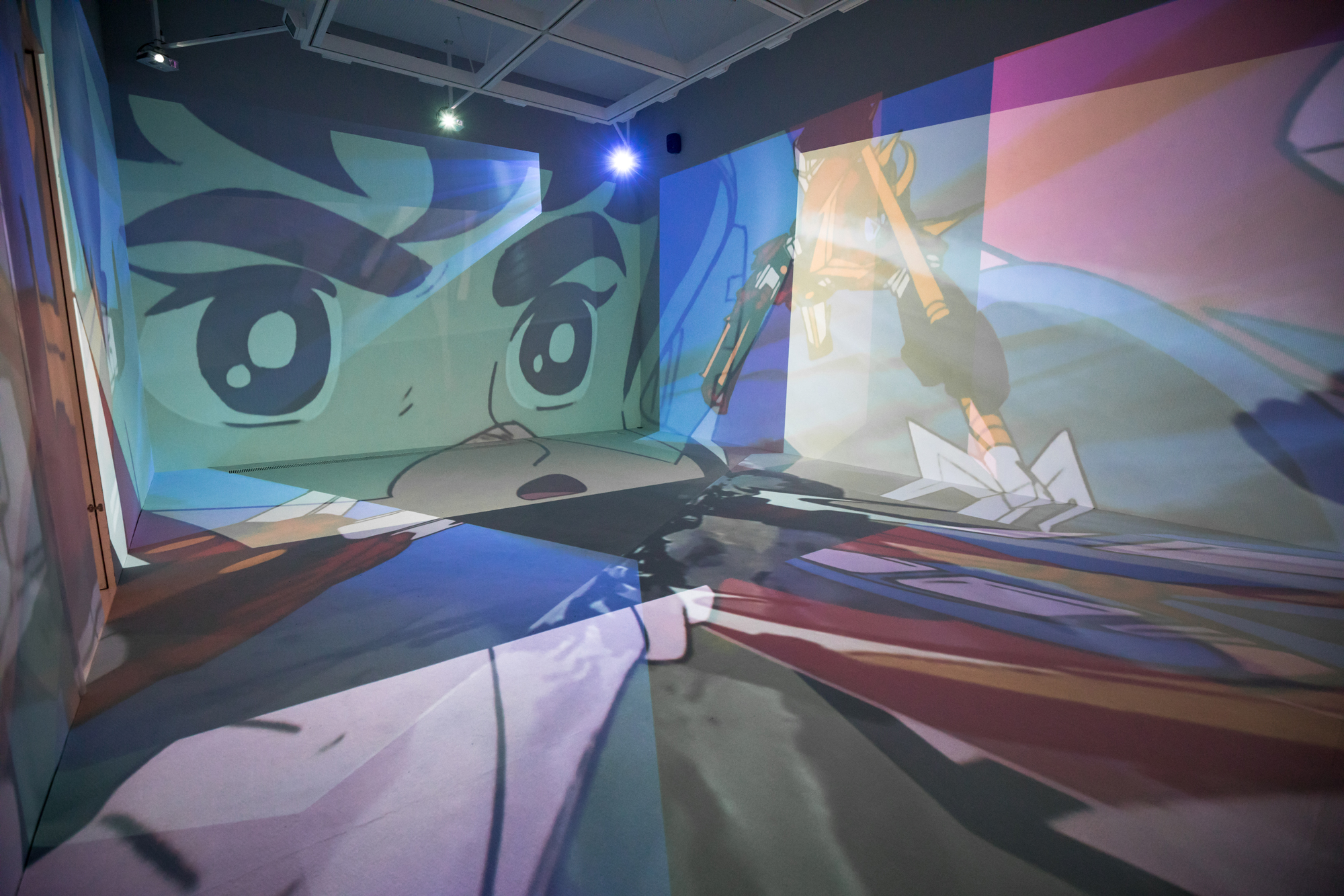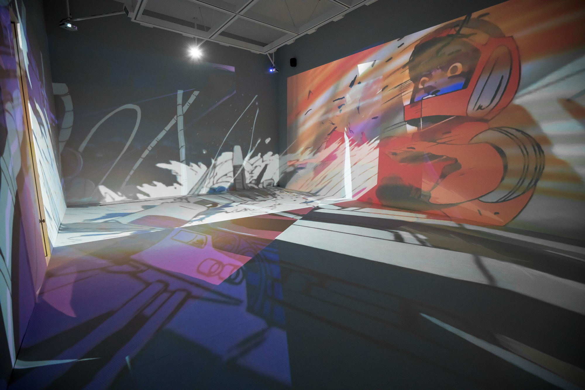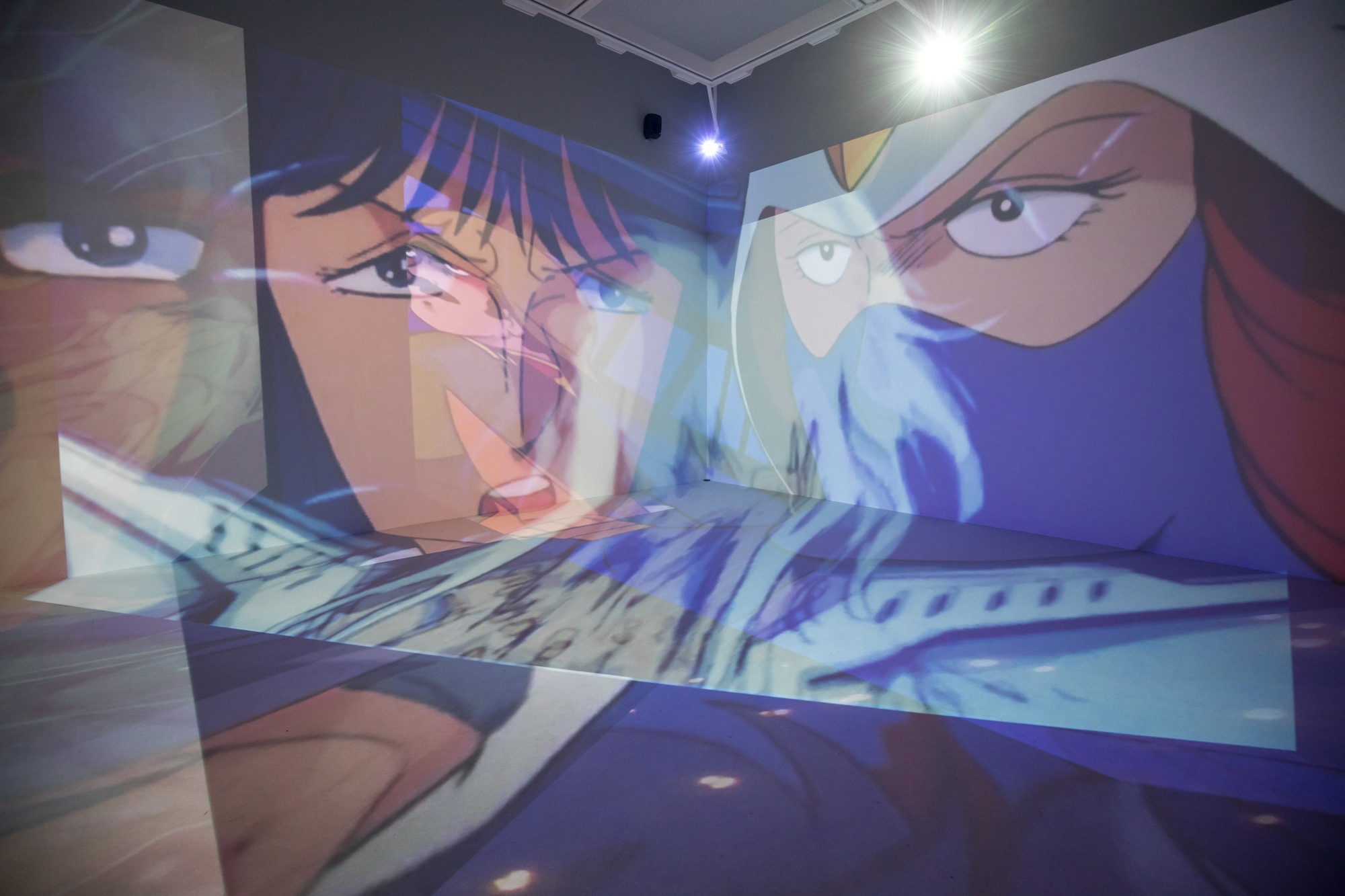 I composed various works that Yoshiyuki Tomino has been involved in as a visual installation that spreads throughout the entire space. Instead of showing the footage on a single screen, I used the found footage technique to dismantle sequences from various works by Yoshiyuki Tomino, and projected multiple images throughout the exhibition space, including walls, floors, and ceilings, overlapping them. I attempted to create a three-dimensional editing style that allows viewers to experience the visuals throughout the entire space and reconstructed it as a visual installation, in which new stories emerge from multiple overlapping images.