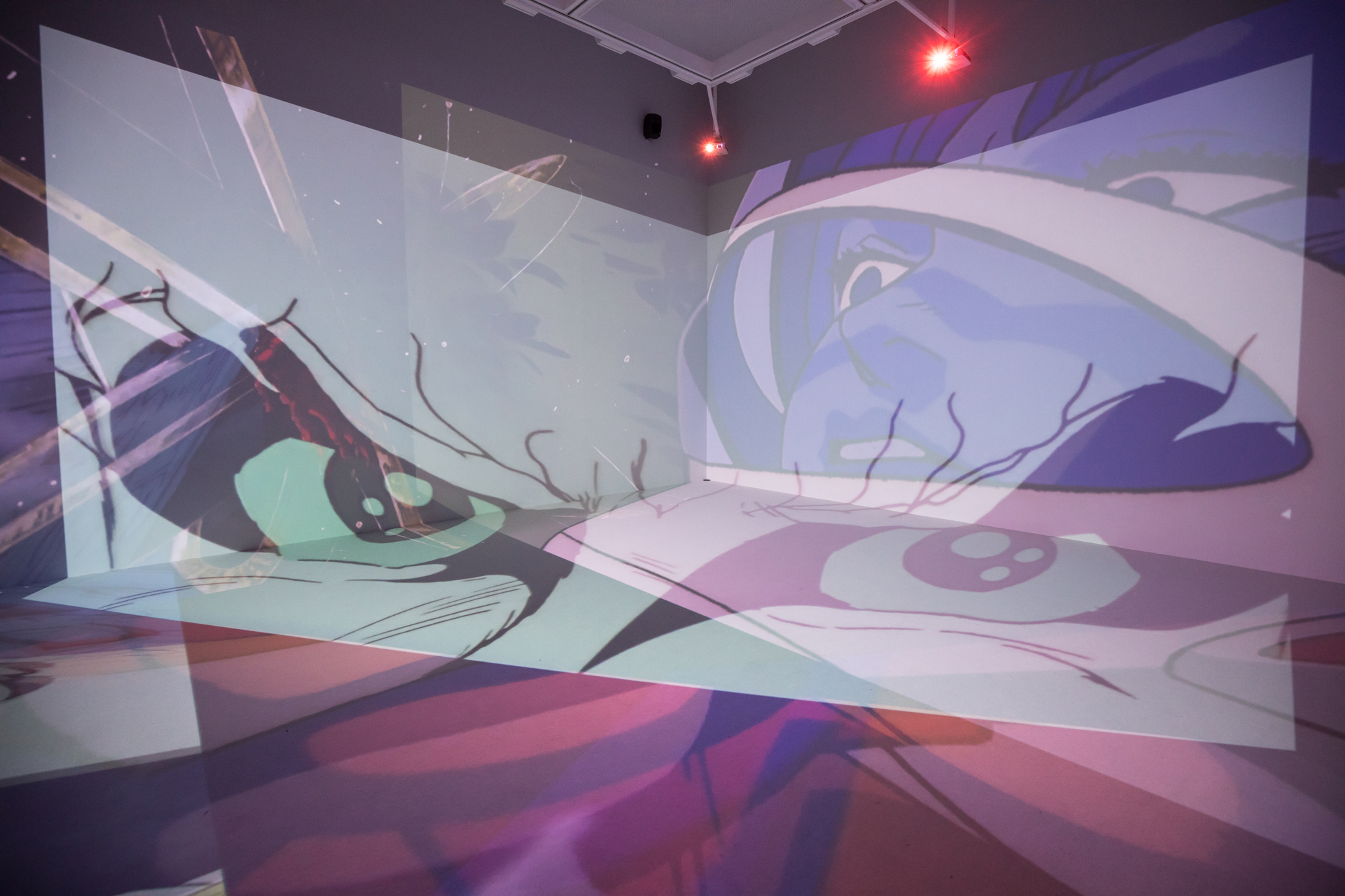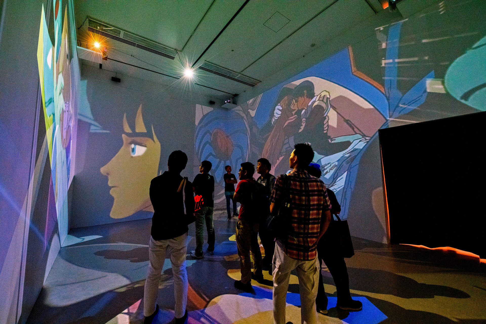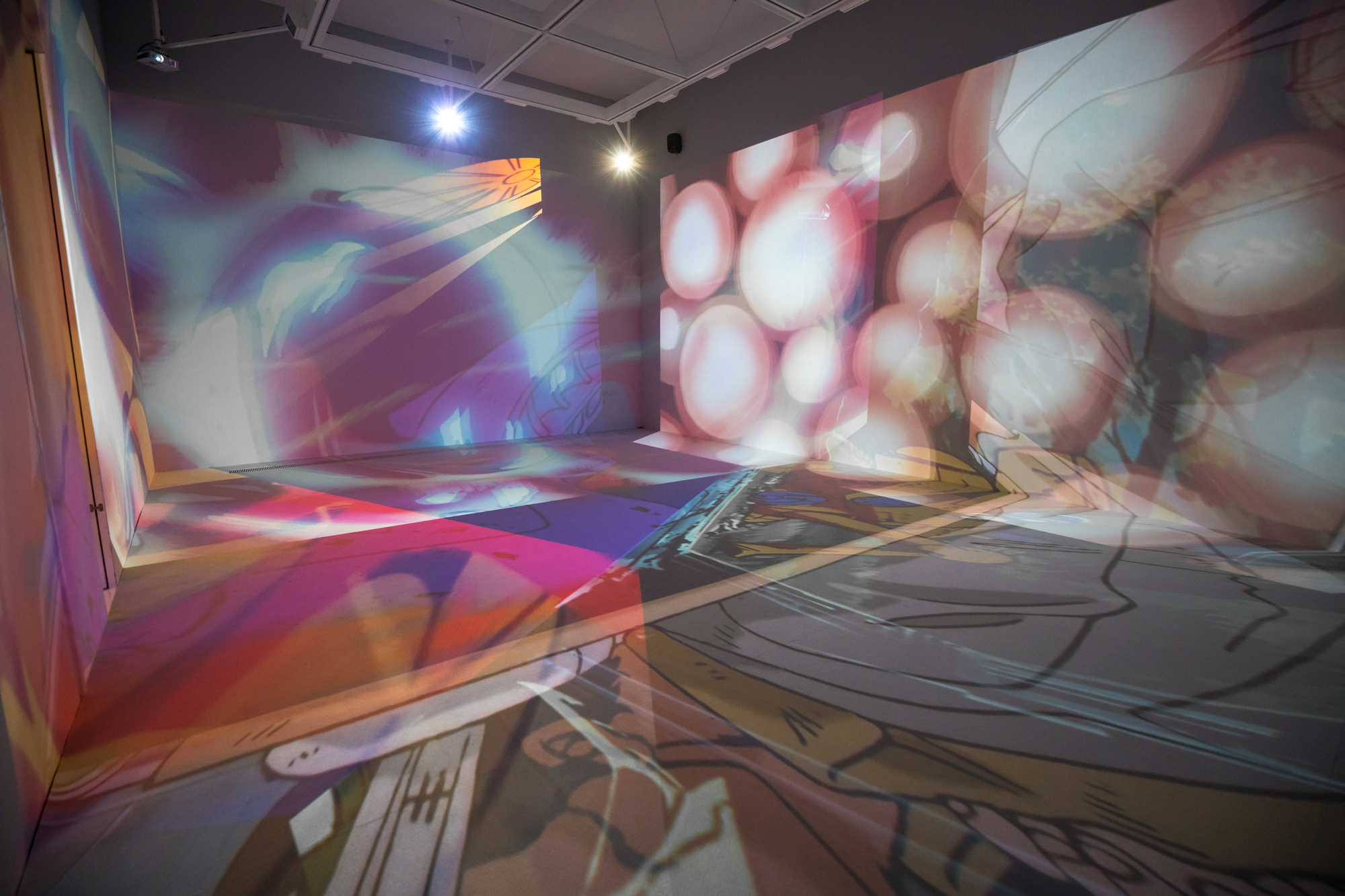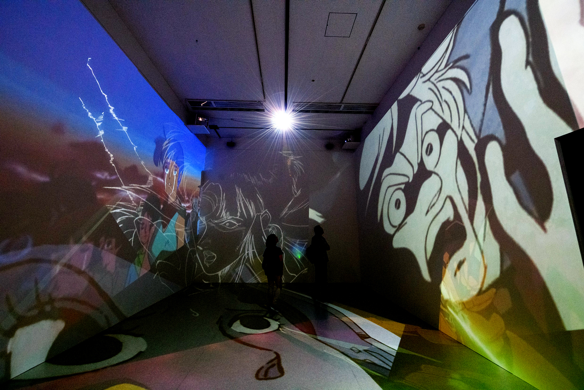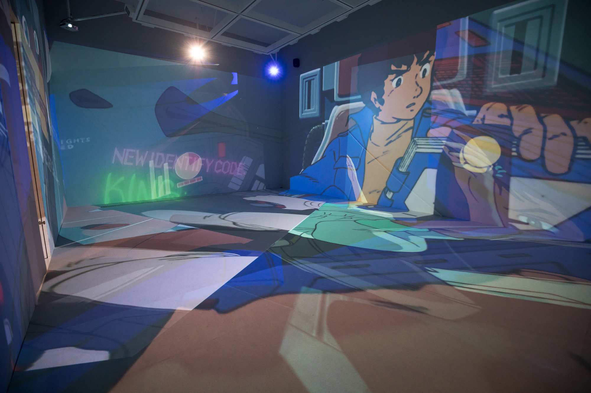 I composed various works that Yoshiyuki Tomino has been involved in as a visual installation that spreads throughout the entire space. Instead of showing the footage on a single screen, I used the found footage technique to dismantle sequences from various works by Yoshiyuki Tomino, and projected multiple images throughout the exhibition space, including walls, floors, and ceilings, overlapping them. I attempted to create a three-dimensional editing style that allows viewers to experience the visuals throughout the entire space and reconstructed it as a visual installation, in which new stories emerge from multiple overlapping images.